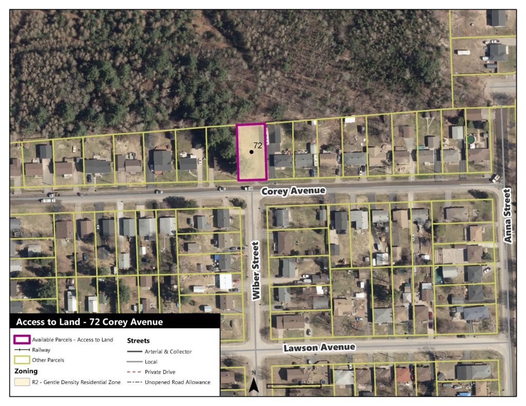 This is a single lot on Corey Avenue at Wiber Street. On November 3, 2025, Council passed a by-law (2025-154) to rezone this property from Parks and Recreation to R2-Gentle Density Residential Zone, to allow for residential development. This property is currently vacant.