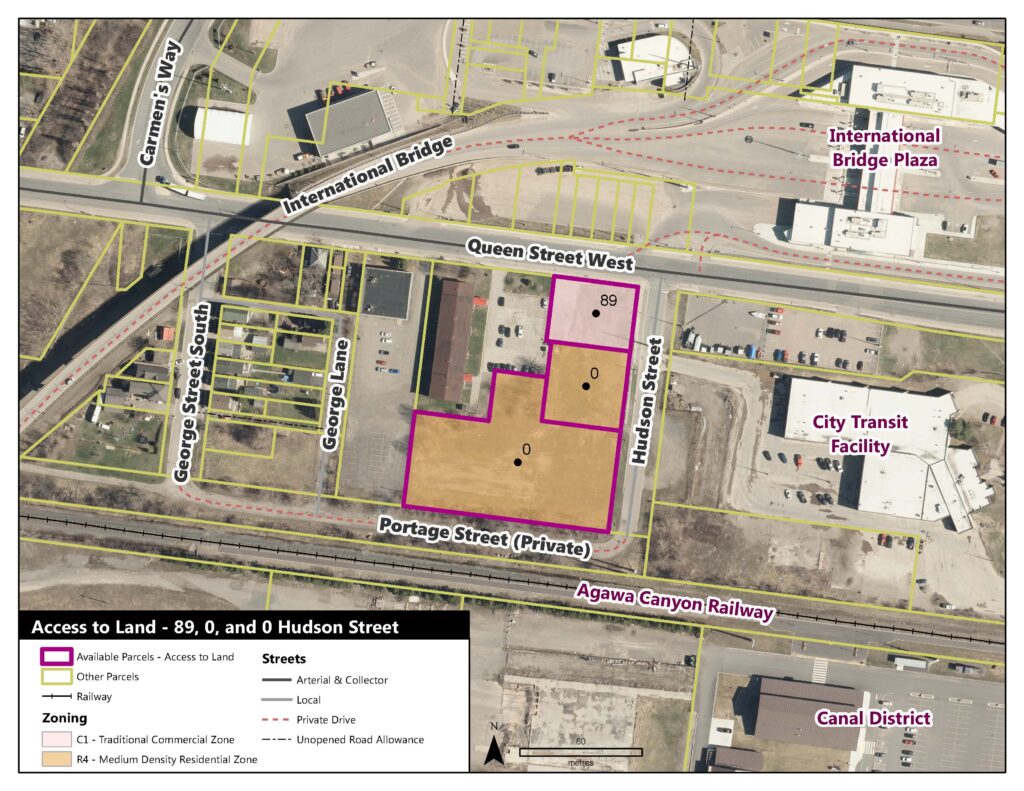 - Vehicle access is limited to Queen Street West or Hudson Street (Portage Street to the south is a private road).