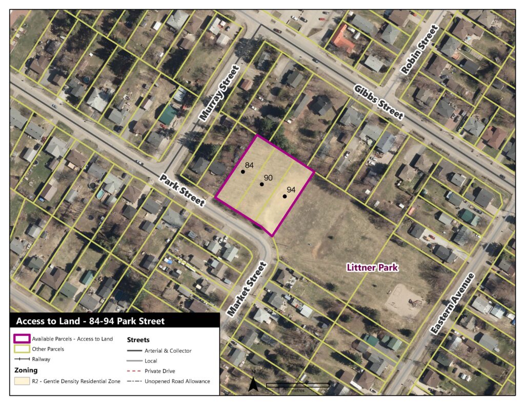 This is a group of three adjacent properties located at Park Street and Market Street in the City’s east end. On September 2, 2025, Council passed a by-law (2025-134) to deem these lots as not registered for purposes of subdivision control, pursuant to section 50(4) of the Planning Act. As such, these lots will be consolidated and sold as a single property.